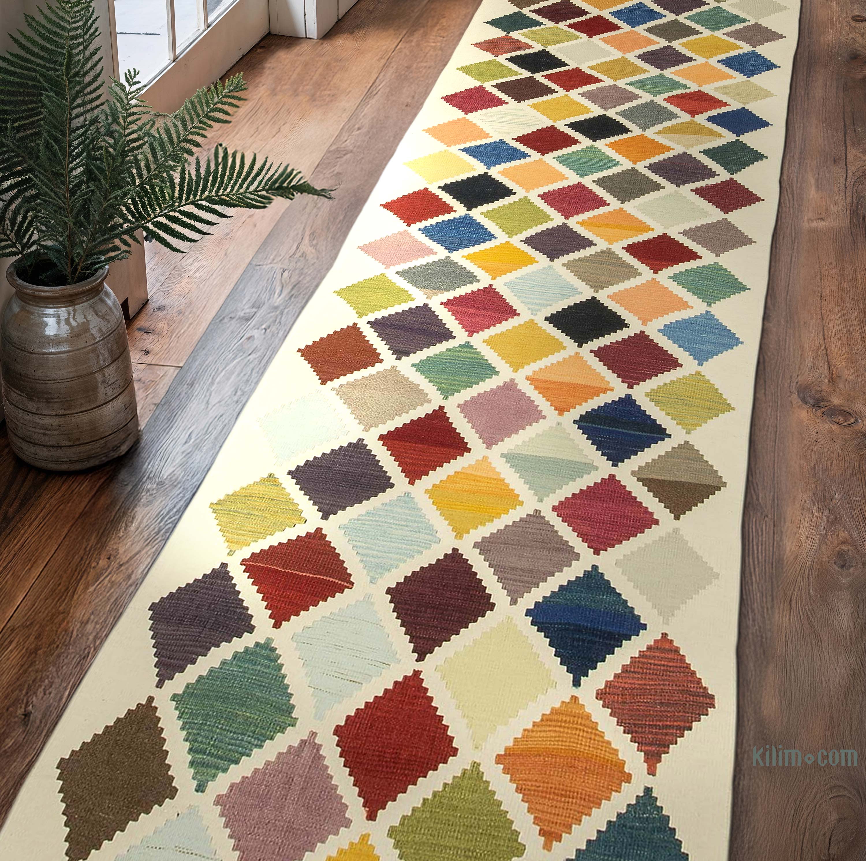 2' 11" x 11' (35" x 132"). We can fold in the fringes upon request. If you like the design of this rug, but need it in a different size, we can custom make it to meet your requirements. For more on the history, symbolism, and care of kilims, including tips on cleaning, displaying, and dyeing, visit our comprehensive