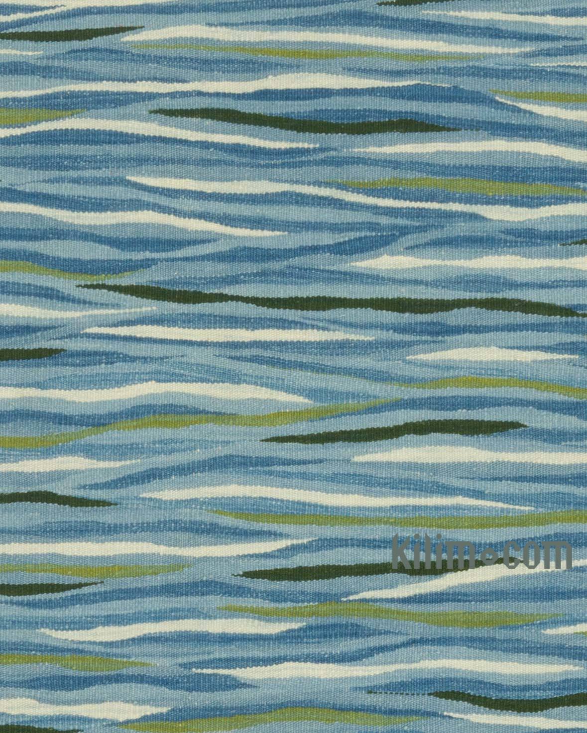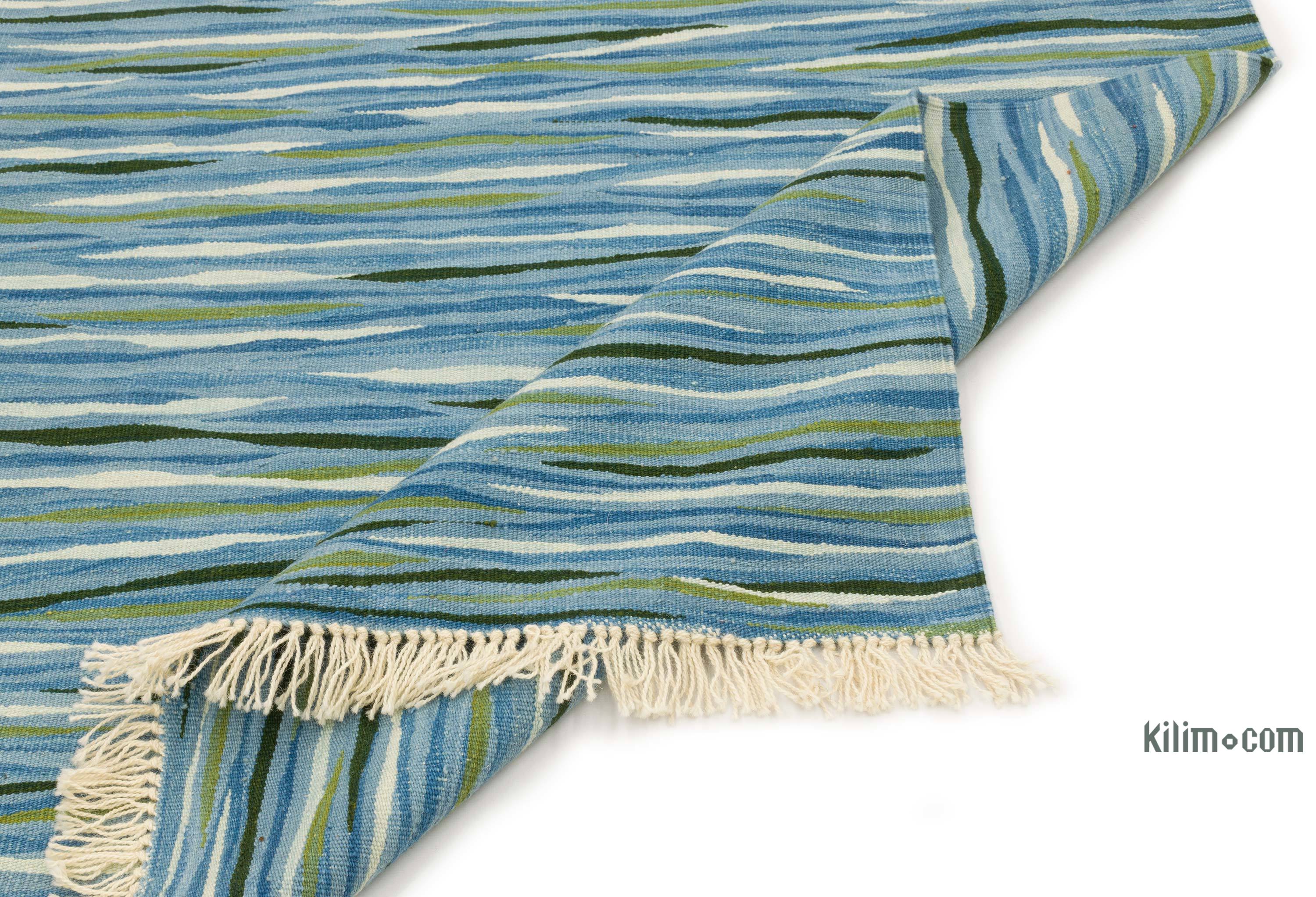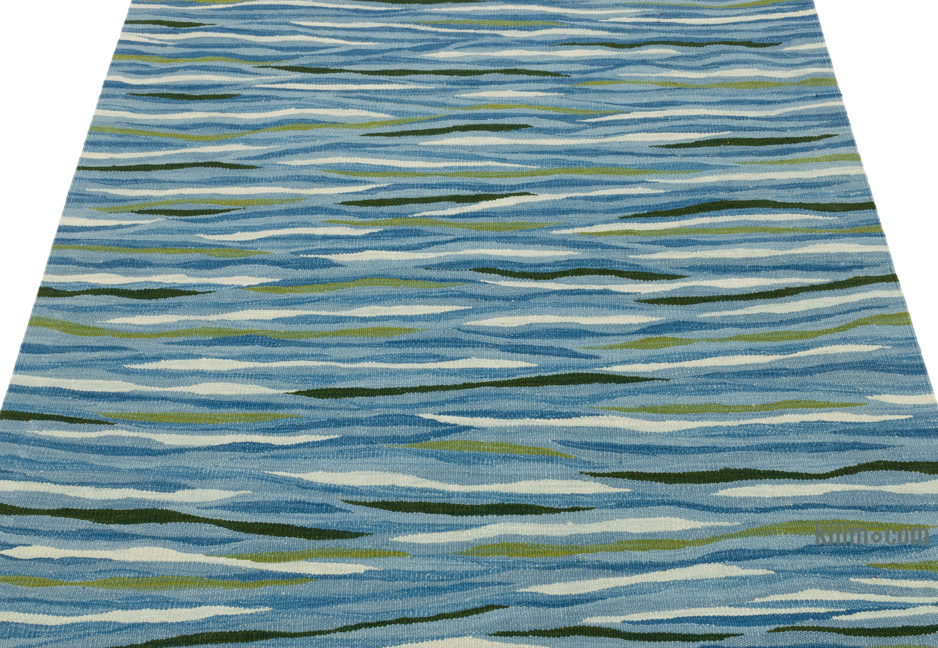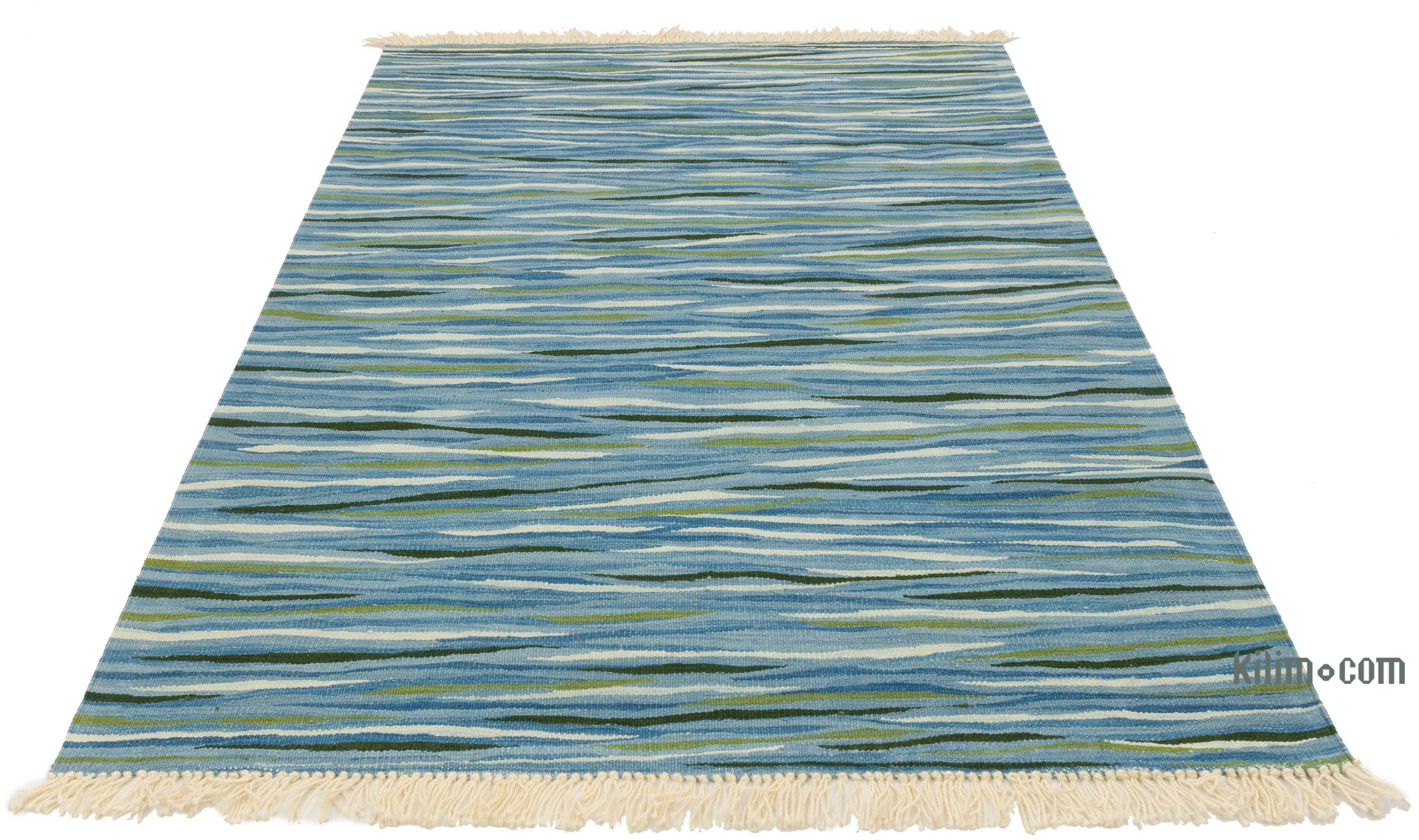 This blue, green rug measures