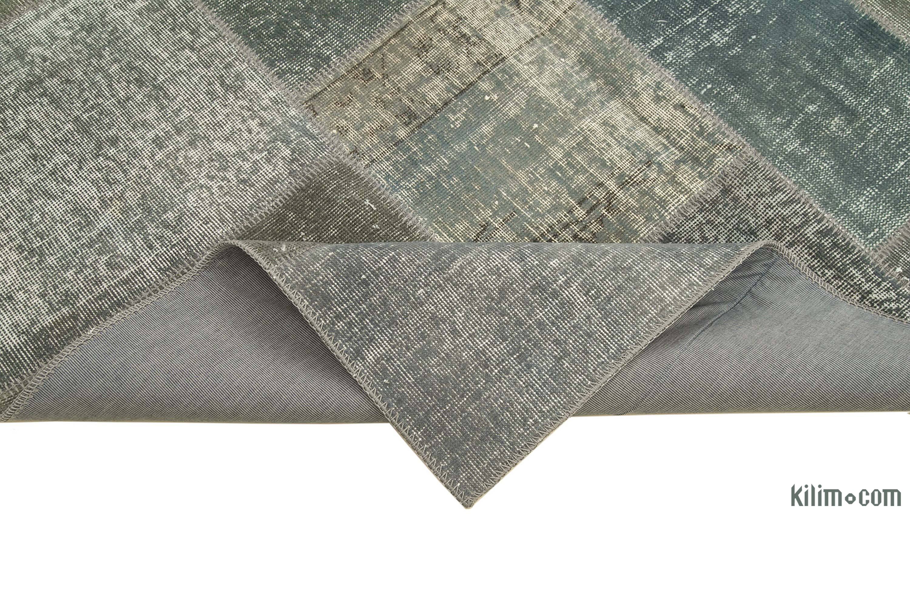 We select vintage Turkish hand-knotted rugs woven in the second half of the 20th century to create our collection of over-dyed patchwork rugs. We wash the colors, trim the piles, but care to keep the original patterns still alive. We then over dye them with a new color of choice, cut them into smaller pieces and hand sew the fragments together with a sturdy yarn. We back the patchwork rug with buckram and a cotton cloth that strengthens the rug. The rearrangement of the fragments transforms the ancient craft of rug making into unique artwork suited for contemporary settings at home or in offices. This particular patchwork rug measures 5' 7" x 7' 10" (67" x 94").