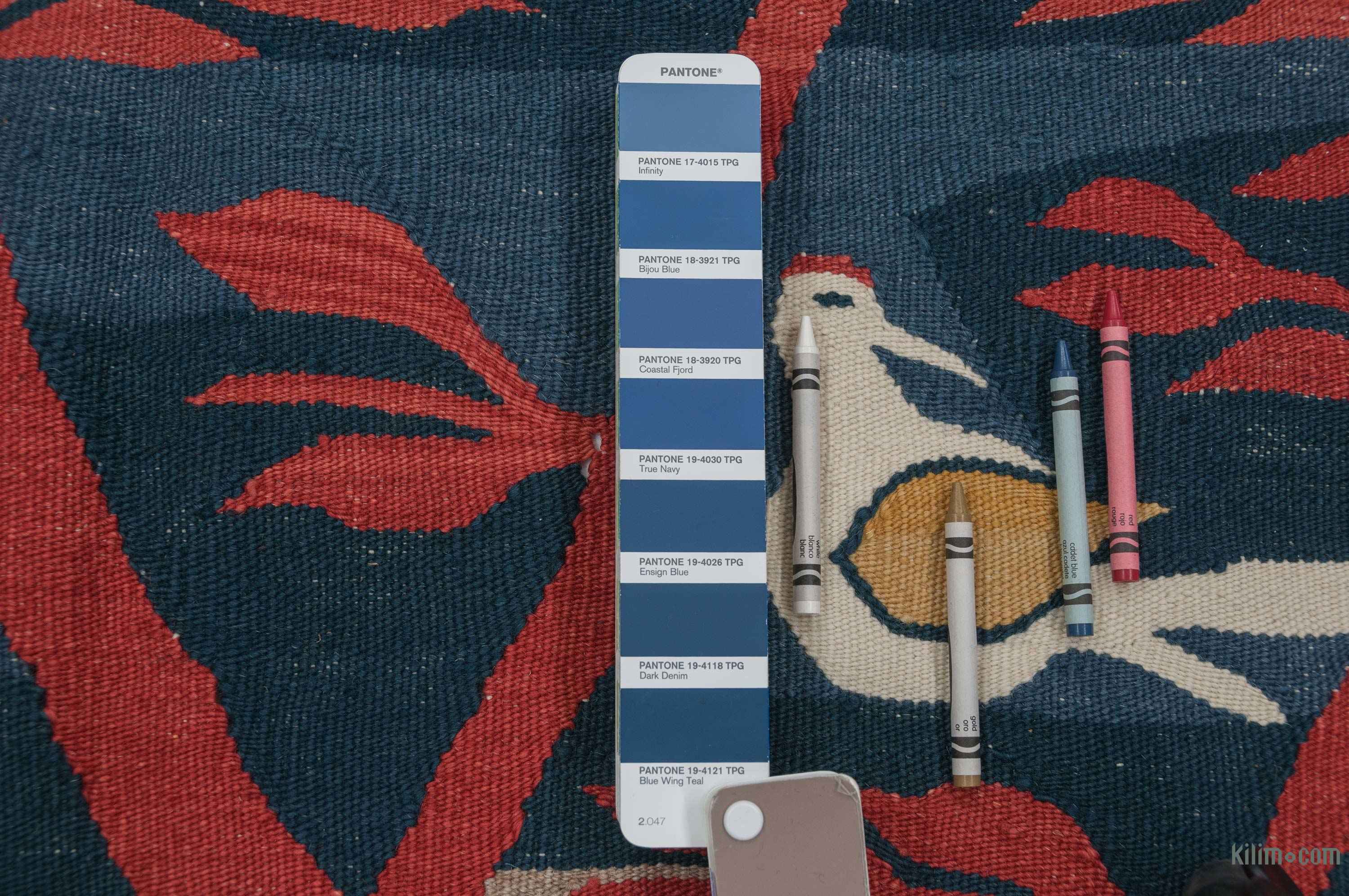 Transforme su espacio de vida maravillosamente con nuestras nuevas alfombras kilim hechas a mano, auténticas y atemporales que llevan consigo muchos de los elementos tradicionales que hacen que las alfombras Kilim turcas vintage tan preciosas. Cada kilim está hábilmente tejido a mano en Turquía para crear una bella obra de arte. Usamos lana teñida y tejida a mano para asegurarnos de que envejecen con elegancia. Esta fina alfombra azul oscuro mide 333 cm x 257 cm. Si le gusta el diseño de esta alfombra, pero la necesita en diferentes tamaños o colores, podemos personalizarla para que cumpla con sus requisitos. Para obtener información adicional acerca de kilims, sus orígenes, motivos, limpieza, colgado, teñido y más, consulte nuestra wiki.