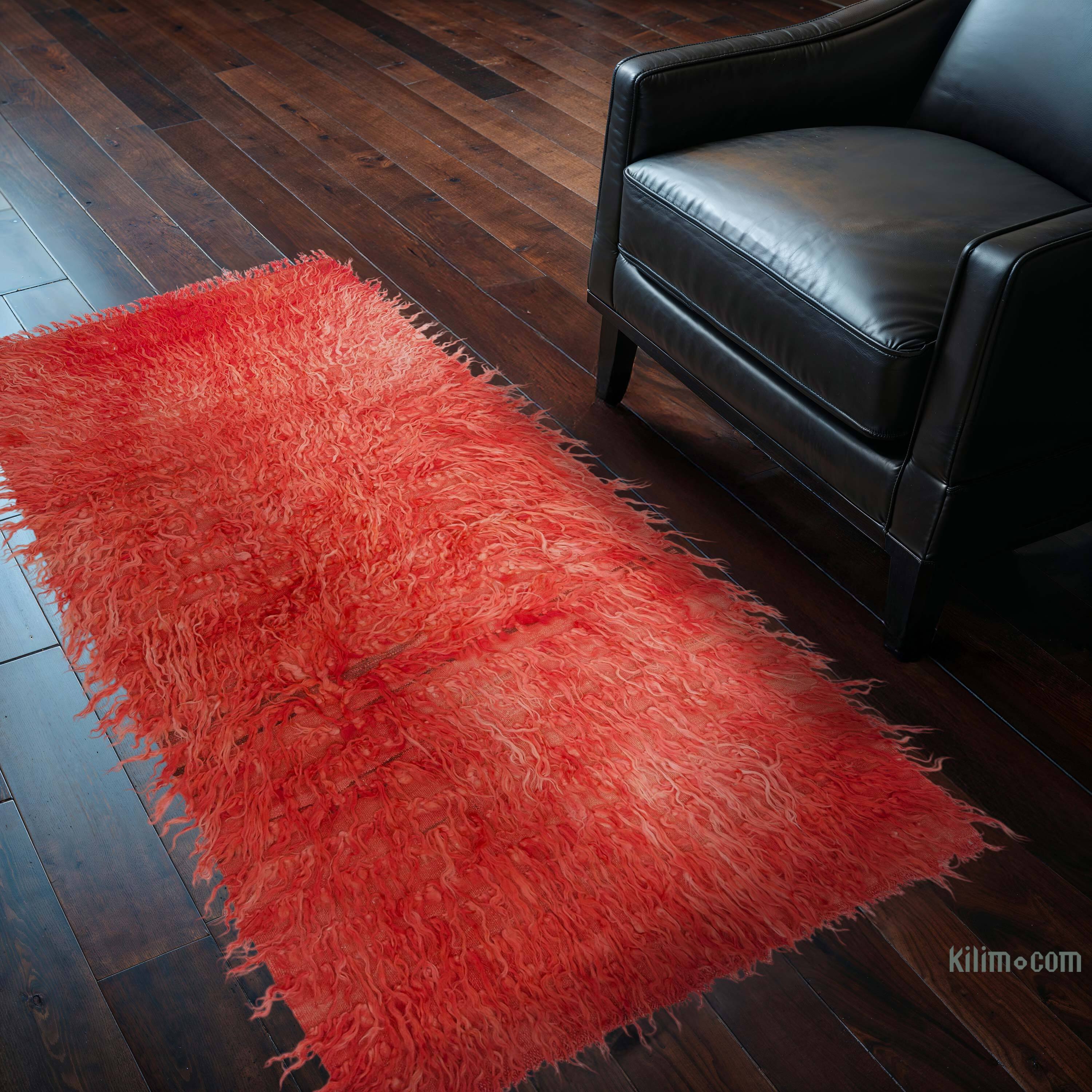 Alfombra vintage tulu tejida a mano en 1960 en Turquía y en excelentes condiciones. Tulu es básicamente un kilim o un tejido liso con mechones de lana o hilos de pelo de cabra entretejidos utilizando el nudo turco para formar patrones de mechones en el diseño subyacente. Tulu es la pronunciación en inglés de la palabra turca, "tüylü" que significa peluda. La técnica utilizada para tejer es muy similar a "gabbeh" en Irán, alfombras "Beni Ourain" de Marruecos y "ryijy" en Finlandia. Todos han sido producidos para fines funcionales en lugar de comercialmente y en regiones montañosas, por lo que todos tienen una gran cantidad de pelo para proteger del frío.