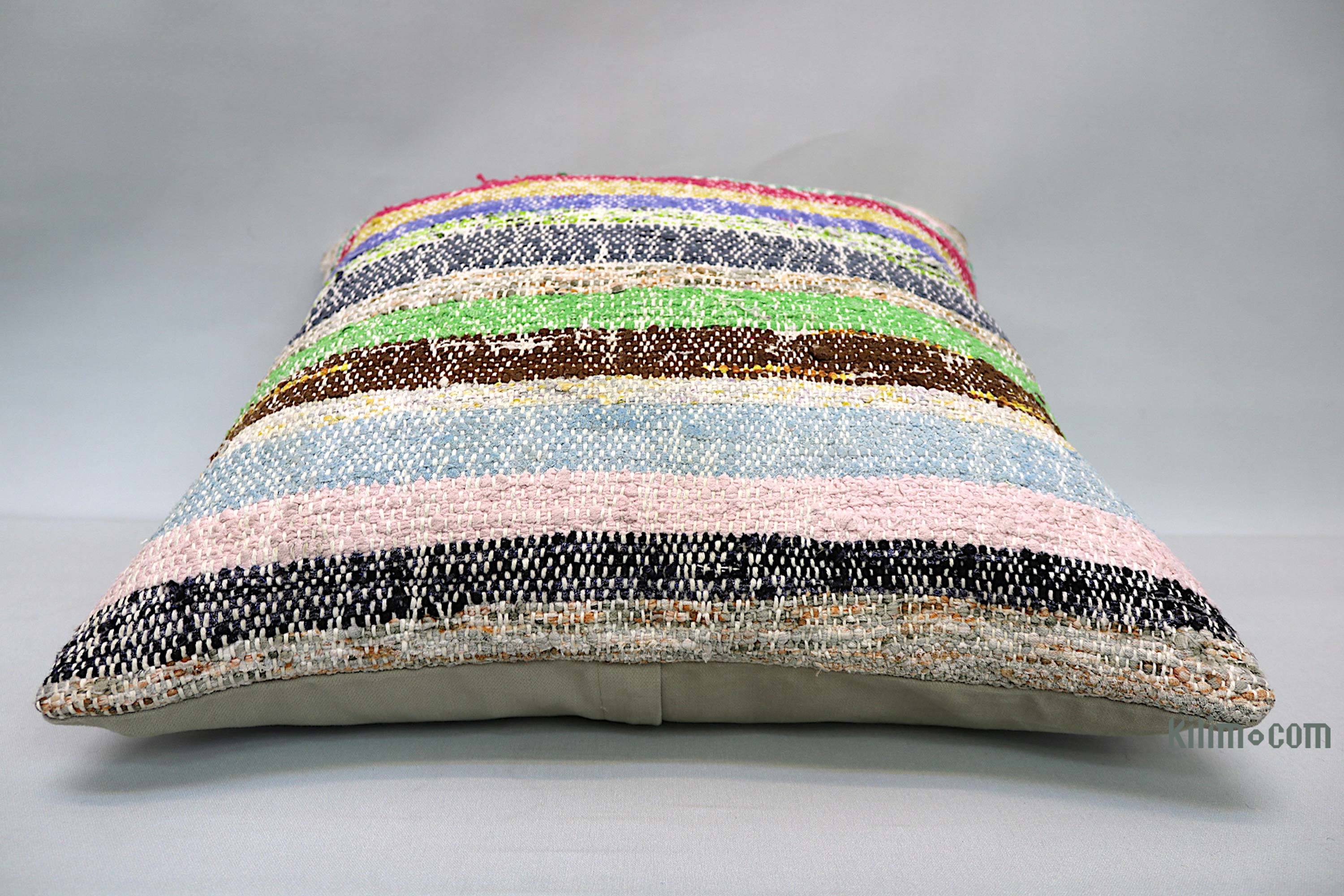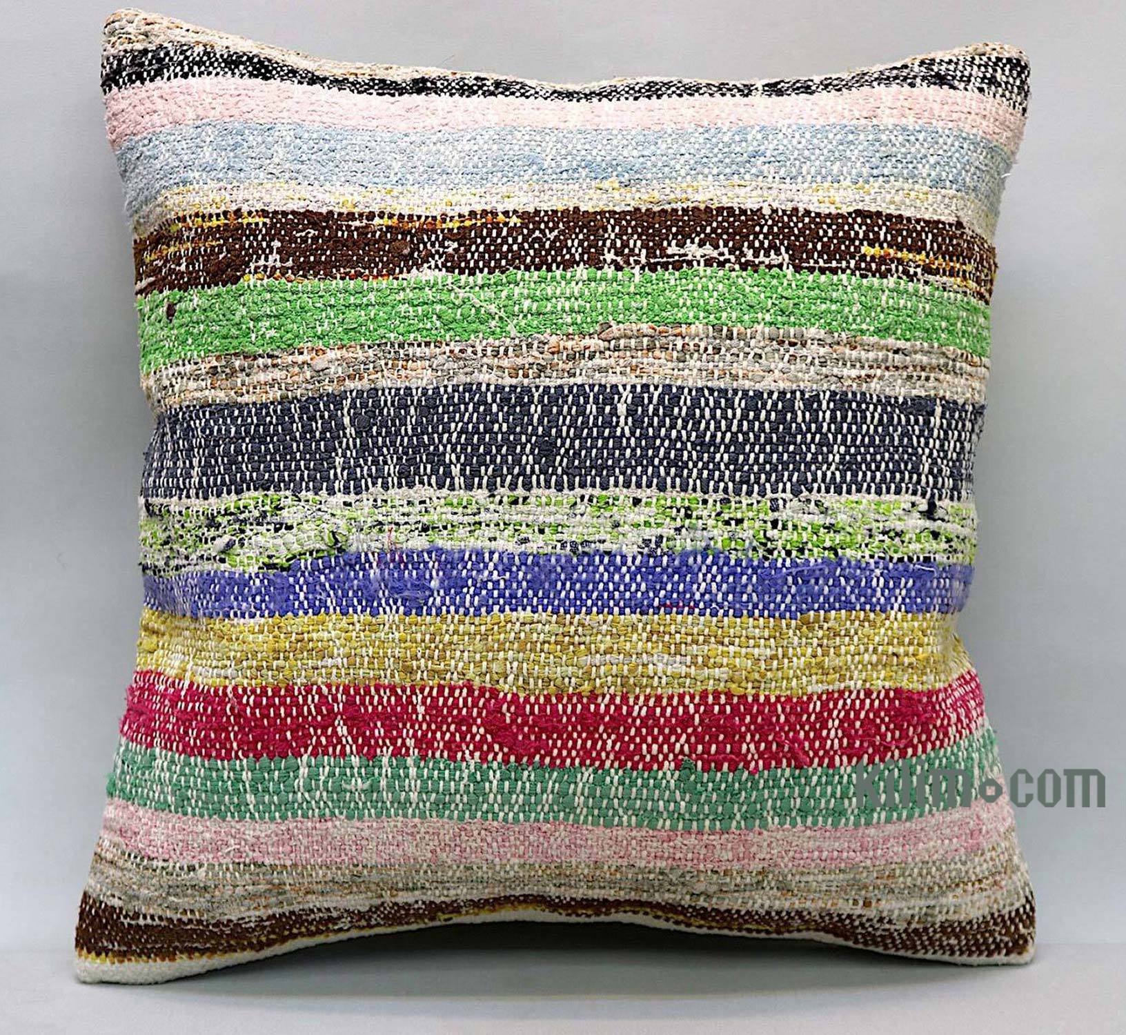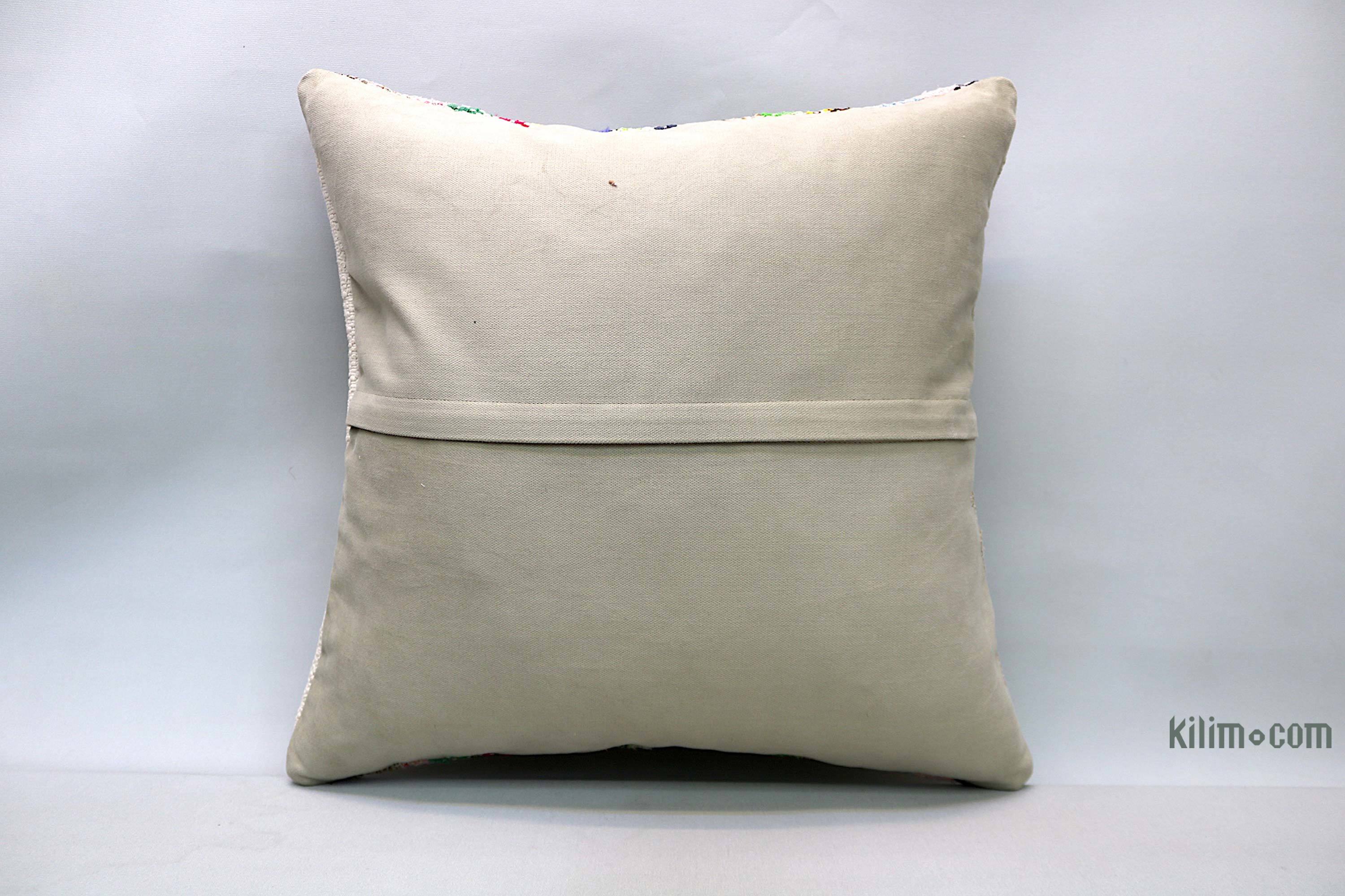 Funda de almohada tejida a mano decorativa hecha de fragmentos kilim turcos de 40-70 años respaldados con tela de algodón. Cierre de cremallera no está incluido.