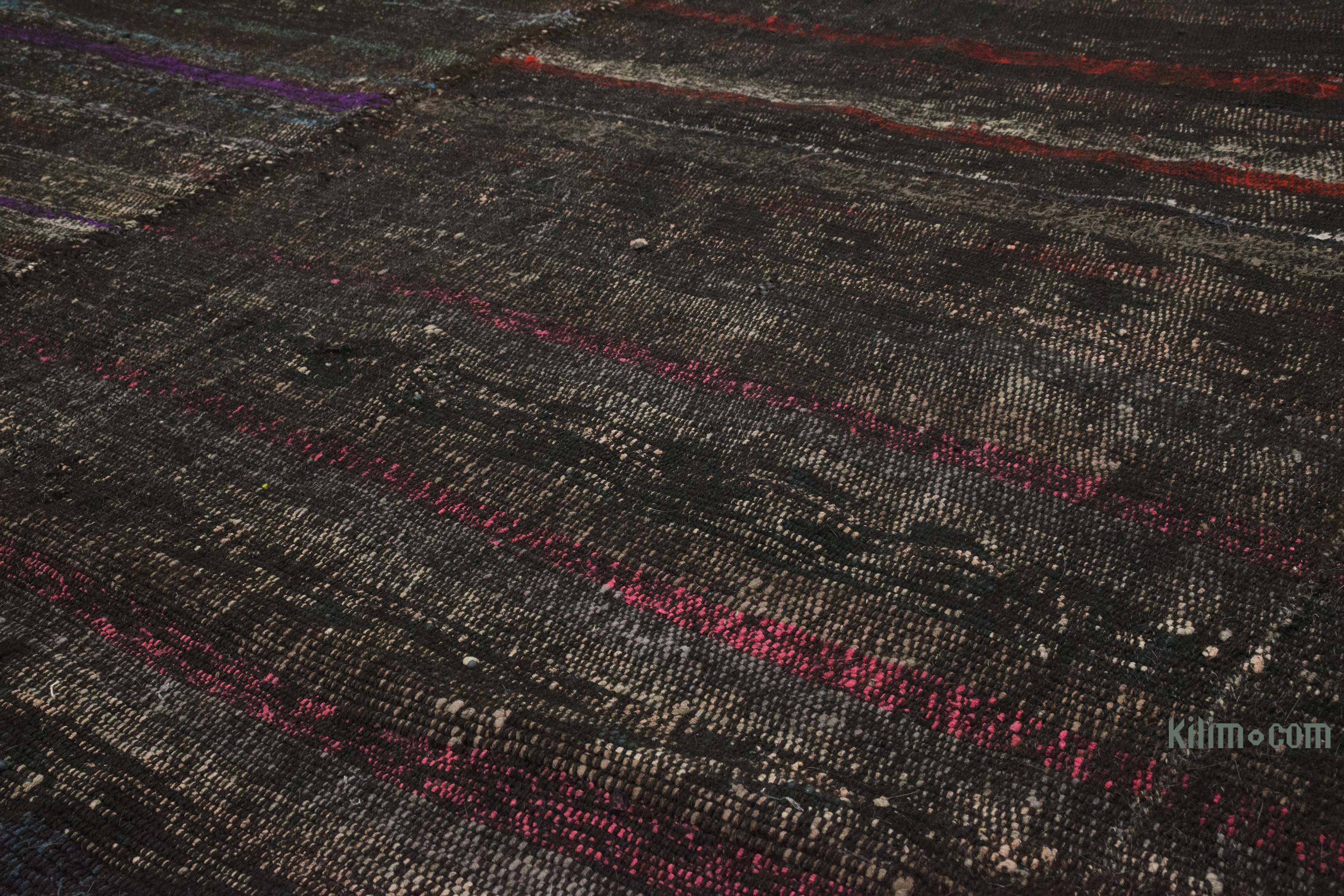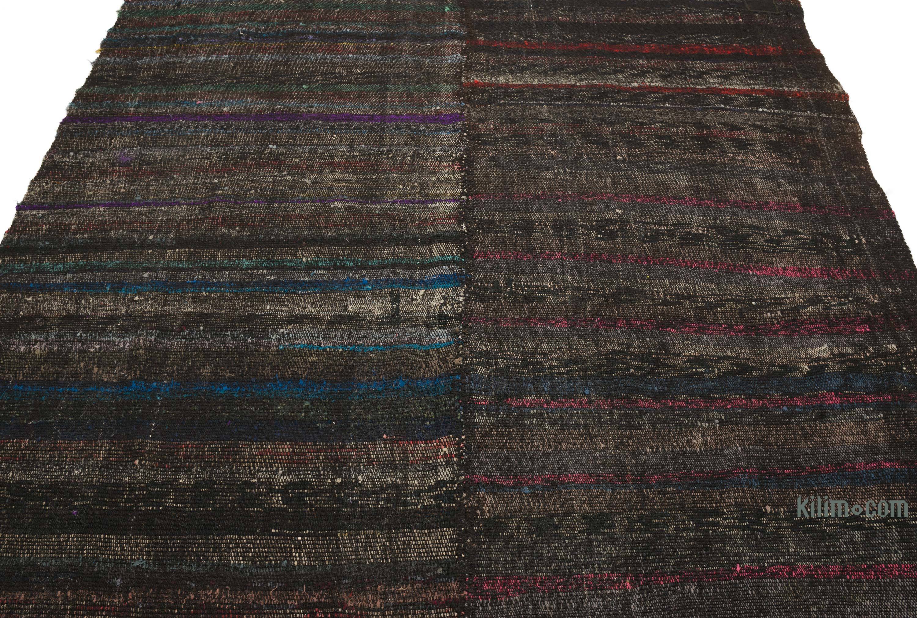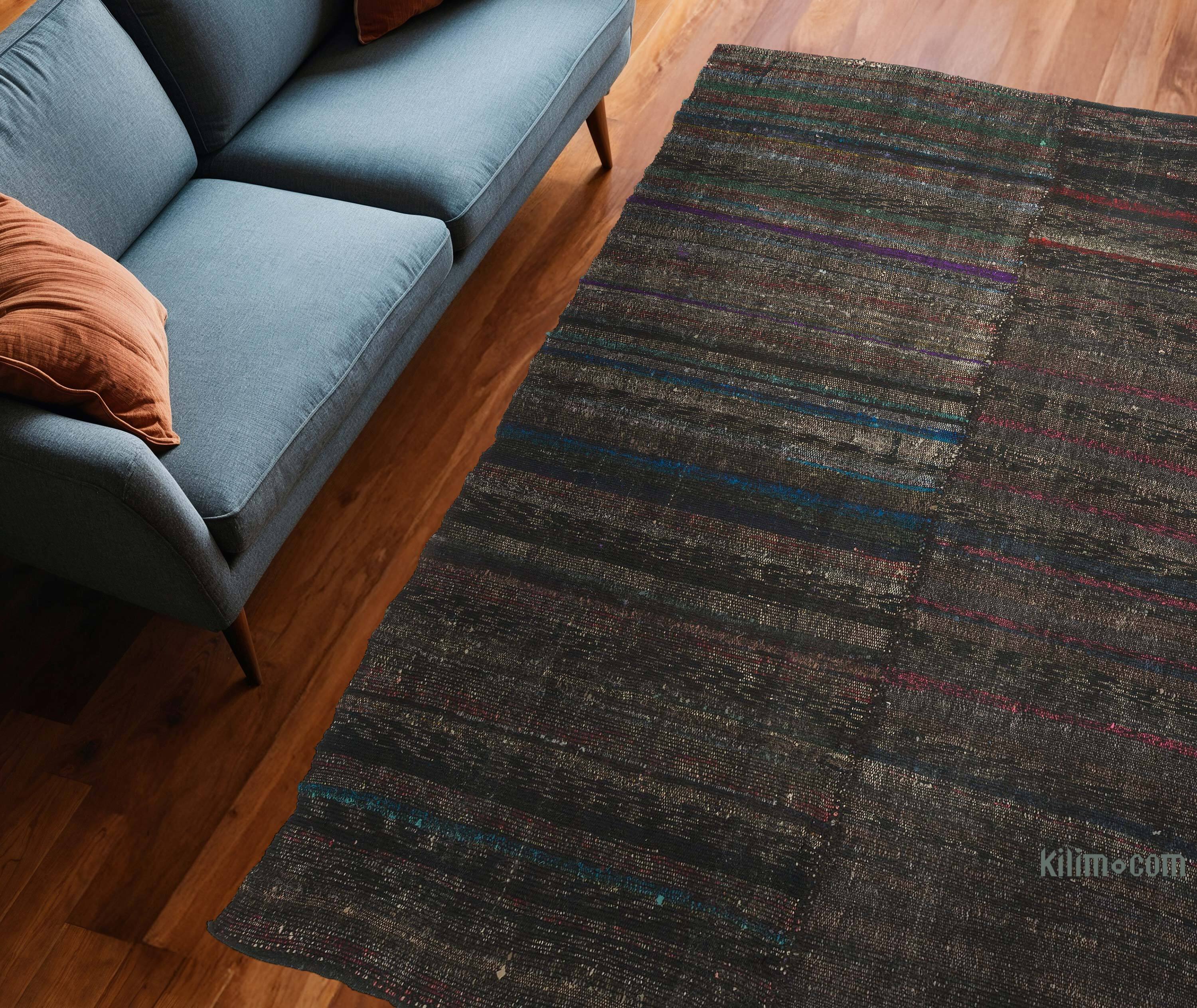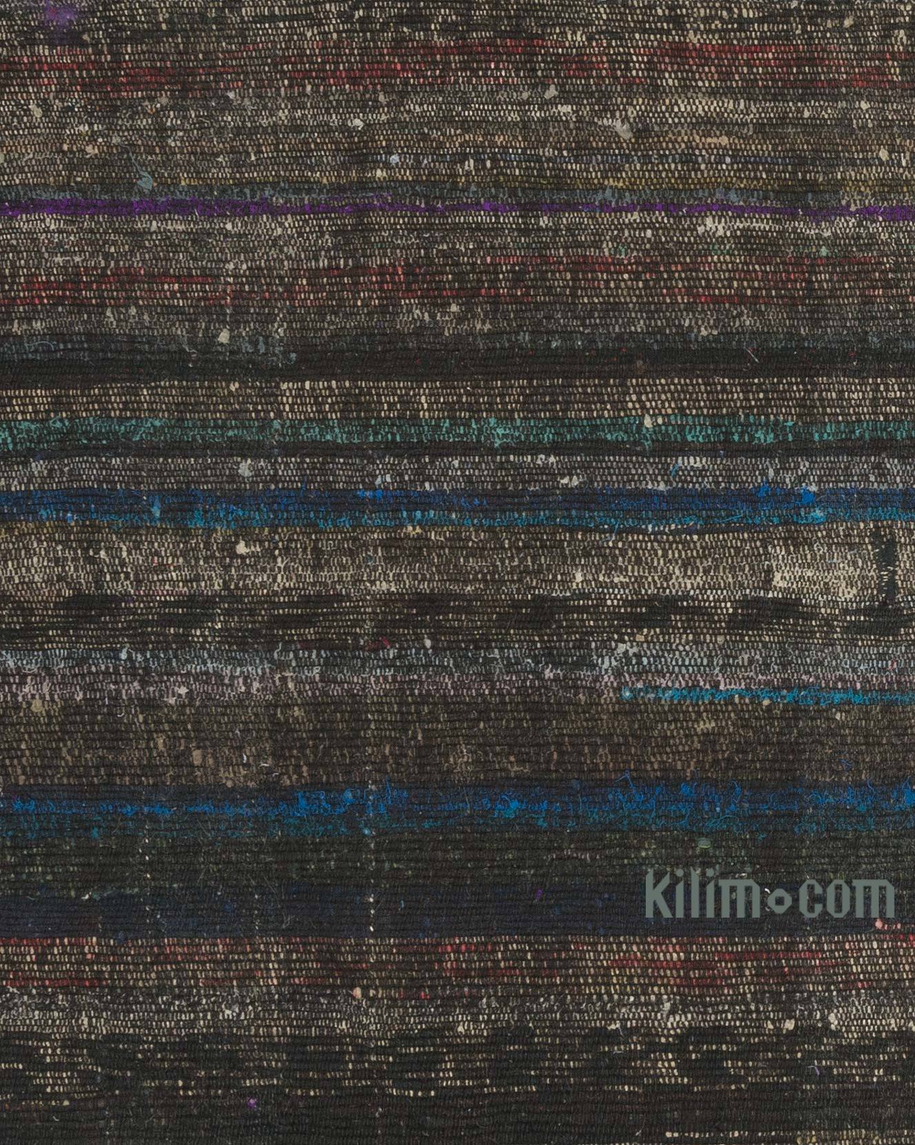 Los kilims vintage "pala" o "chaput", como se los llama en turco, son telas planas hechas a mano con telas recicladas hechas de algodón y pelo de cabra. Se tejieron en telares estrechos y los paneles se cosieron cuidadosamente después para formar dos alfombras reversibles, a veces tres aladas. El tejido de Chaput era una vieja tradición en Asia Menor (Turquía), nacida de la necesidad de reutilizar los textiles viejos, fusionando lo que estaba a mano en piezas decorativas únicas de la artesanía. Respetuosos del medio ambiente y creativos, fueron utilizados como corredores, tapetes o cubrecamas. Dado que la tela no fue reteñida, sino que se empleó en su color original, cada chaput kilim es único en sus colores y tonalidades. Tradicionalmente, vienen en patrones rayados o simples en una paleta de colores muy diversa, lo que los hace fáciles de integrar en cualquier entorno clásico o contemporáneo. Esta alfombra fue tejida como dos piezas y luego cosidas juntas. Todas nuestras alfombras vintage son limpiadas profesionalmente y sin olores.
