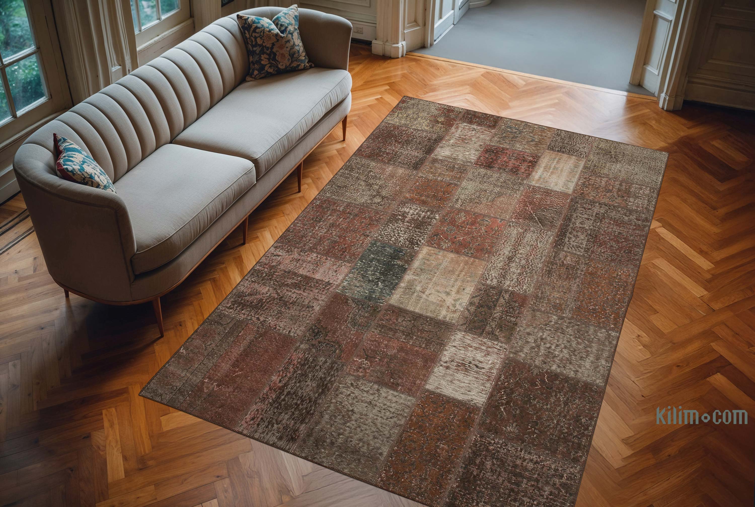 Nuestras Alfombras de Retazos Vintage Sobreteñidas combinan culturas, tradiciones e historia, creando alfombras maravillosamente únicas. Seleccionamos alfombras turcas vintage anudadas a mano, tejidas en los años 60 y 70 para crear nuestra colección de Alfombras de Retazos sobreteñidas. Lavamos los colores, recortamos las pilas, pero cuidamos de mantener los patrones originales aún vivos. Luego los sobrepasamos con un nuevo color de elección, los cortamos en pedazos más pequeños y cosemos a mano los fragmentos con un hilo resistente. Respaldamos las Alfombras de Retazos con bucarán y una tela de algodón que fortalece la alfombra. La reorganización de los fragmentos transforma la antigua fabricación de alfombras en una obra de arte única adecuada para la configuración contemporánea en el hogar o en oficinas. Esta particular Alfombra de Retazos mide 202 cm x 298 cm. Eche un vistazo a nuestro artículo Obtenga la Apariencia "Vivida" para obtener más información sobre las alfombras vintage sobreteñidas y de retazos.
