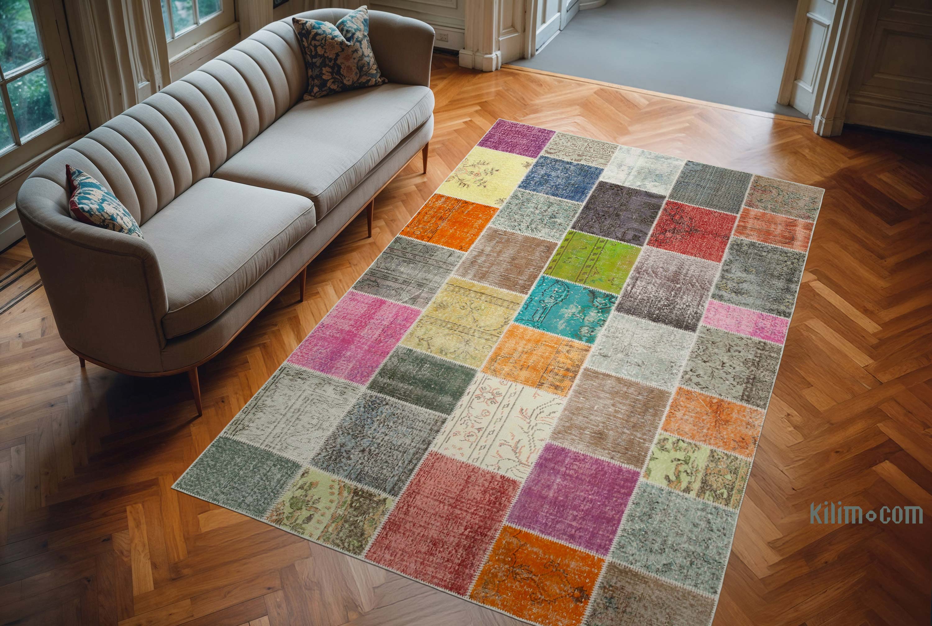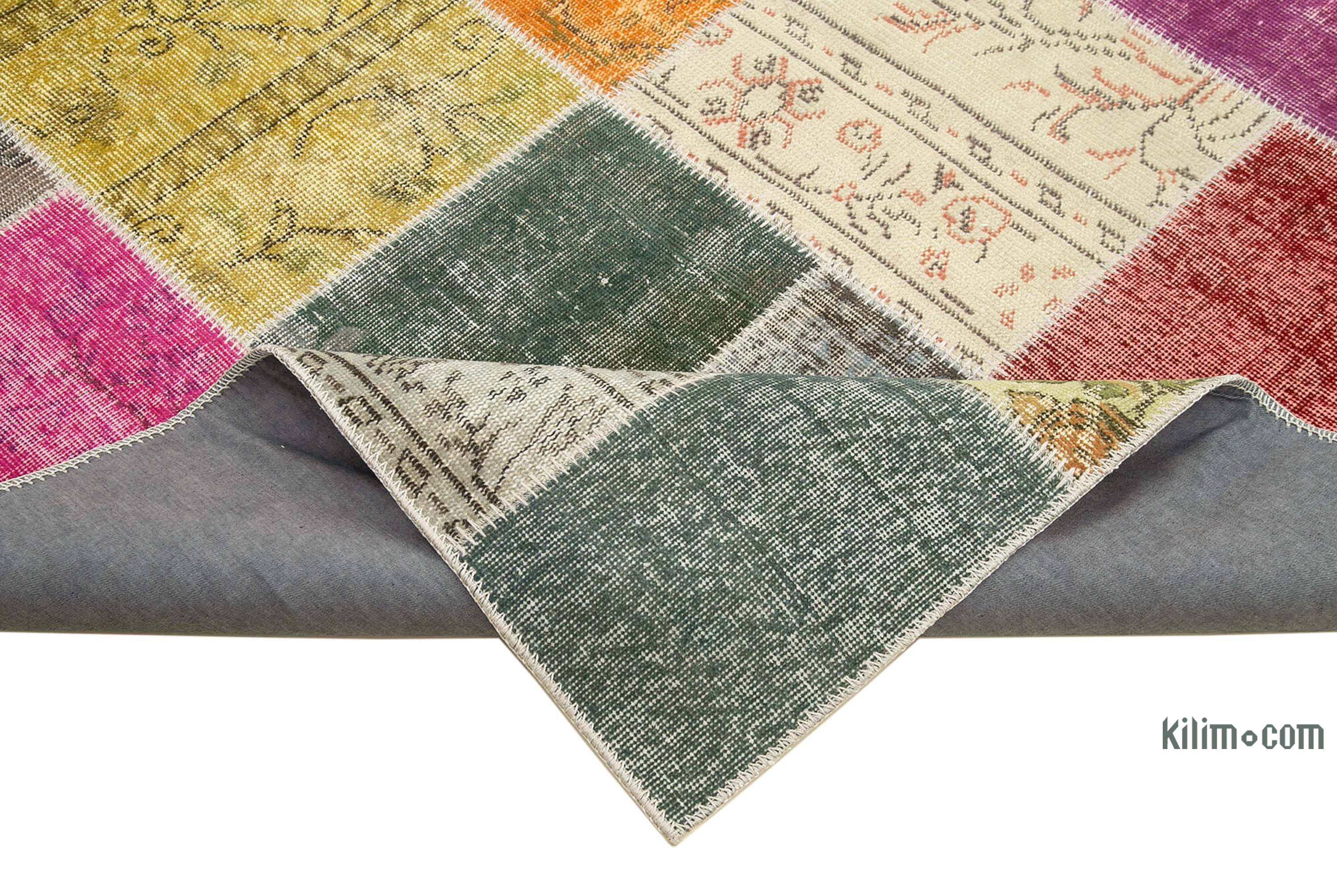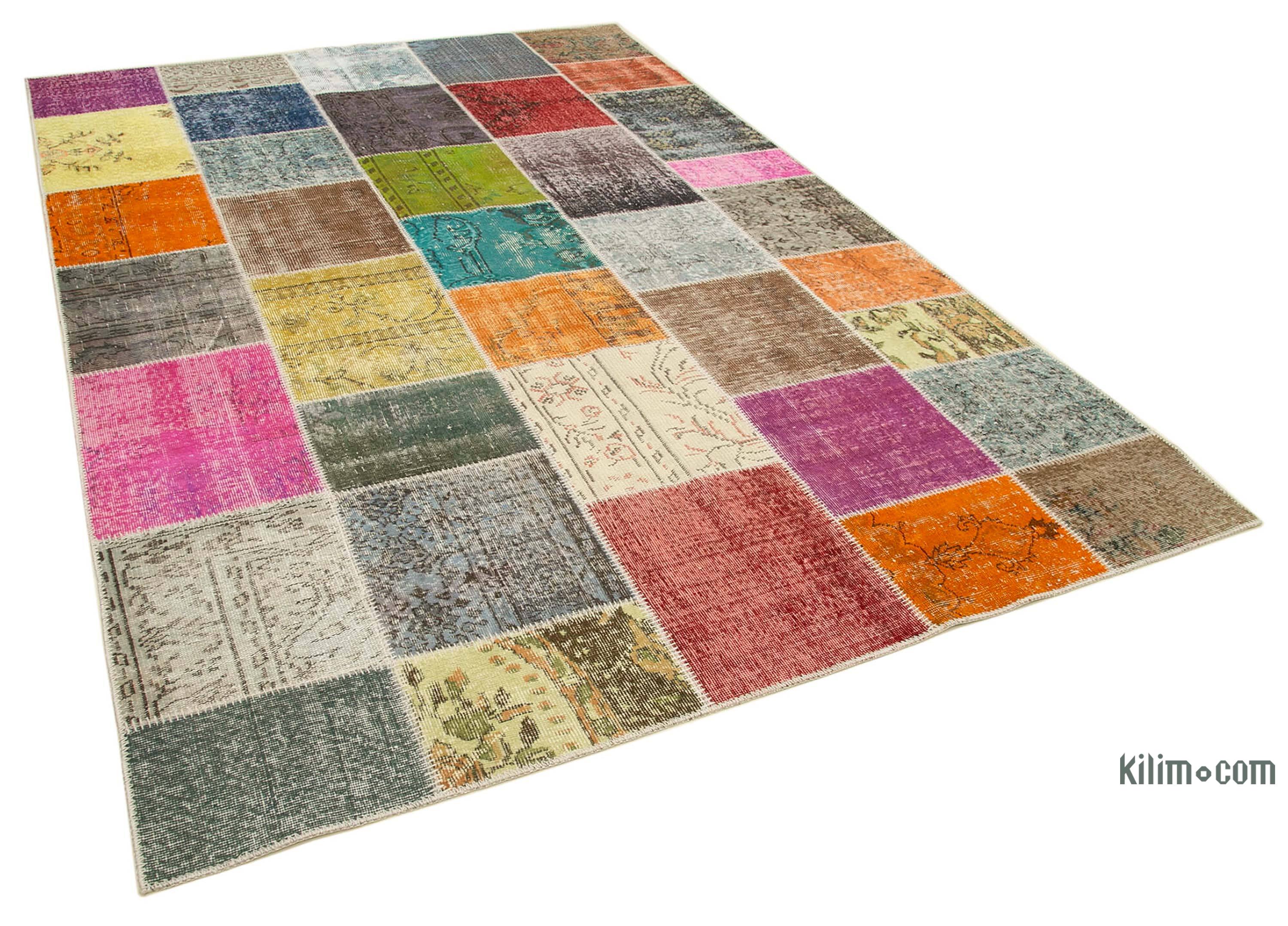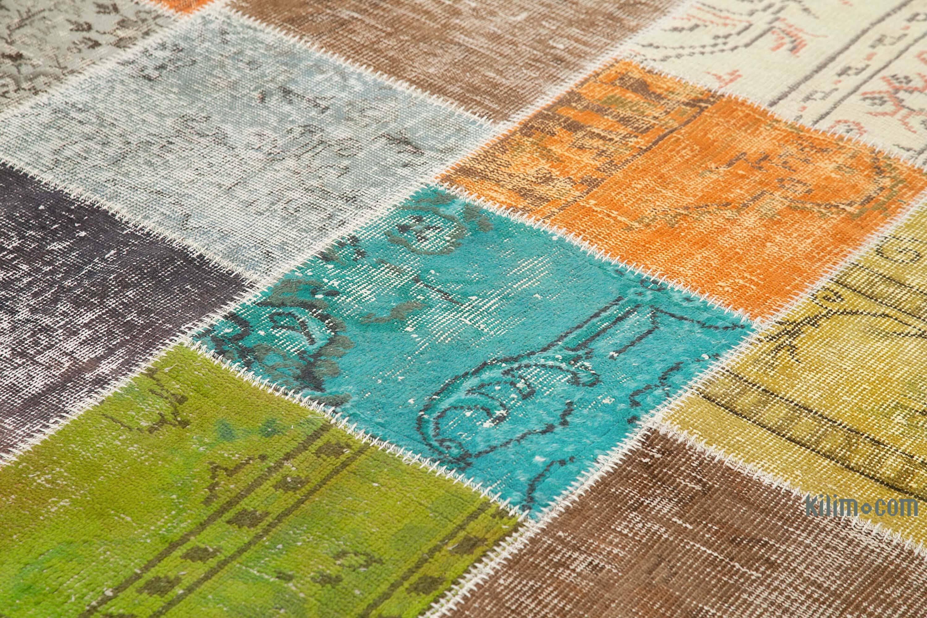 Nuestras Alfombras de Retazos Vintage Sobreteñidas combinan culturas, tradiciones e historia, creando alfombras maravillosamente únicas. Seleccionamos alfombras turcas vintage anudadas a mano, tejidas en los años 60 y 70 para crear nuestra colección de Alfombras de Retazos sobreteñidas. Lavamos los colores, recortamos las pilas, pero cuidamos de mantener los patrones originales aún vivos. Luego los sobrepasamos con un nuevo color de elección, los cortamos en pedazos más pequeños y cosemos a mano los fragmentos con un hilo resistente. Respaldamos las Alfombras de Retazos con bucarán y una tela de algodón que fortalece la alfombra. La reorganización de los fragmentos transforma la antigua fabricación de alfombras en una obra de arte única adecuada para la configuración contemporánea en el hogar o en oficinas. Esta particular Alfombra de Retazos mide 205 cm x 297 cm. Eche un vistazo a nuestro artículo Obtenga la Apariencia "Vivida" para obtener más información sobre las alfombras vintage sobreteñidas y de retazos.
