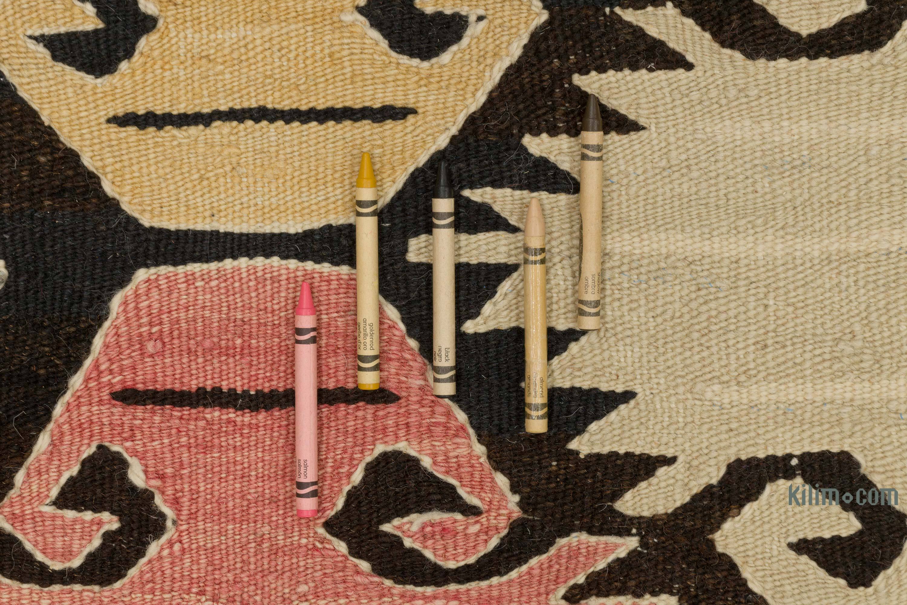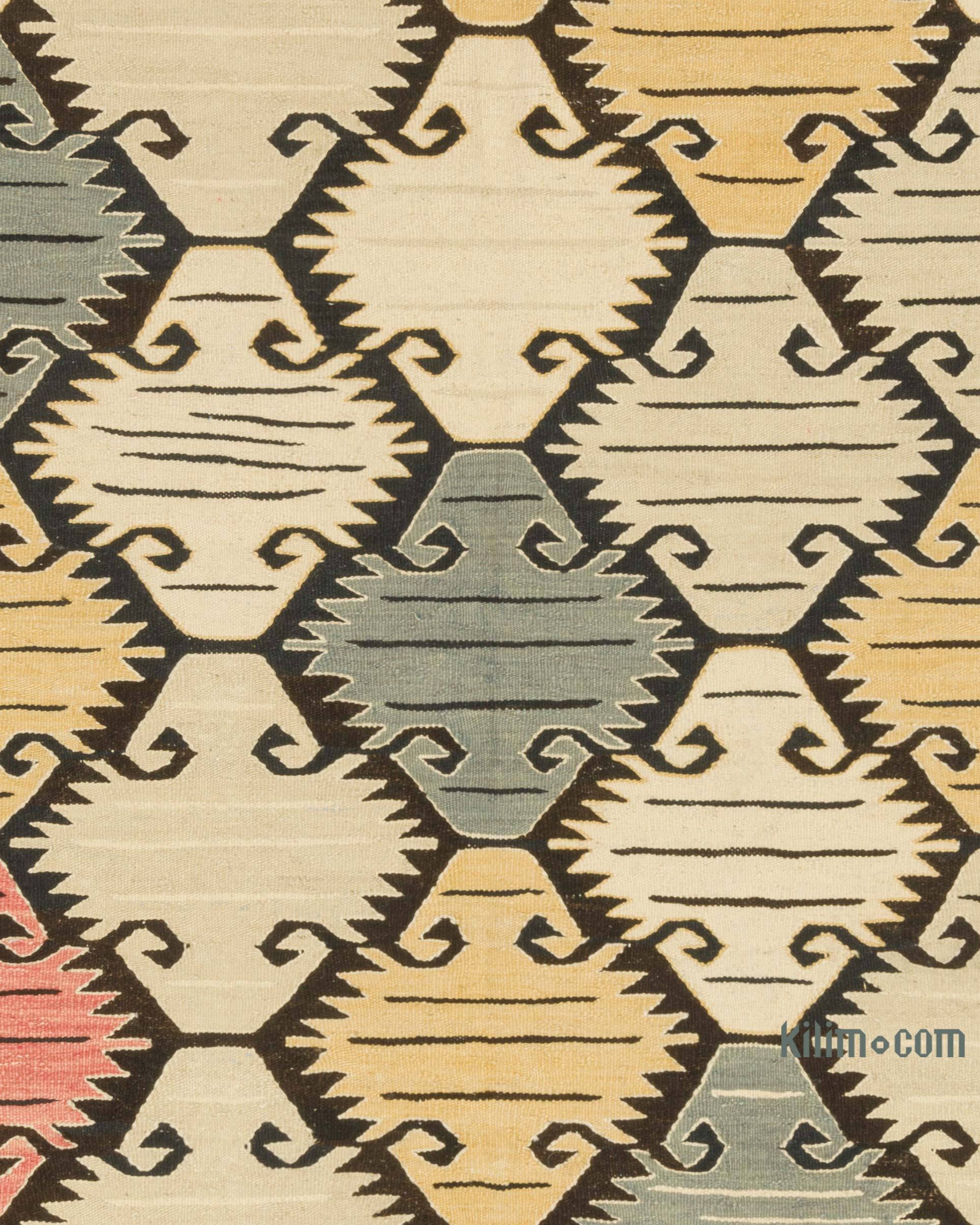 Transforme su espacio de vida maravillosamente con nuestras nuevas alfombras kilim hechas a mano, auténticas y atemporales que llevan consigo muchos de los elementos tradicionales que hacen que las alfombras Kilim turcas vintage tan preciosas. Cada kilim está hábilmente tejido a mano en Turquía para crear una bella obra de arte. Usamos lana teñida y tejida a mano para asegurarnos de que envejecen con elegancia. Esta fina alfombra mide 175 cm x 237 cm. Si le gusta el diseño de esta alfombra, pero la necesita en diferentes tamaños o colores, podemos personalizarla para que cumpla con sus requisitos. Para obtener información adicional acerca de kilims, sus orígenes, motivos, limpieza, colgado, teñido y más, consulte nuestra wiki.