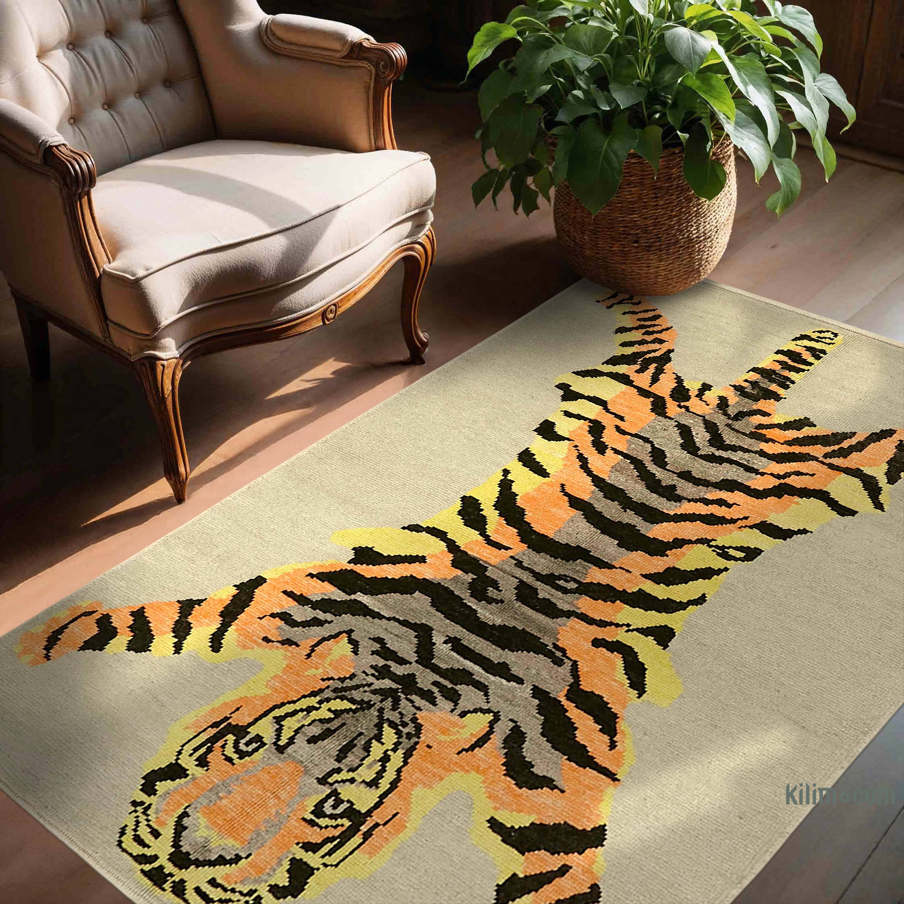 Alfombra Nueva de Nudo a Mano con Diseño de Tigre - 143 cm x 193 cm