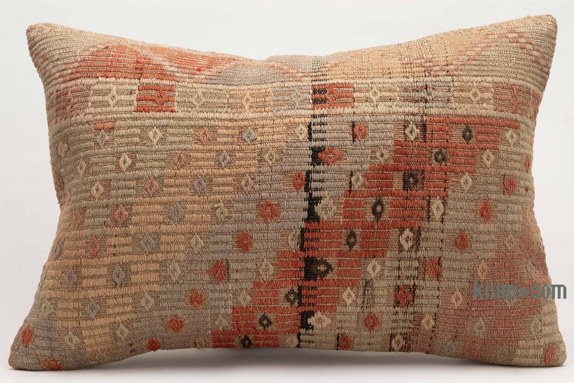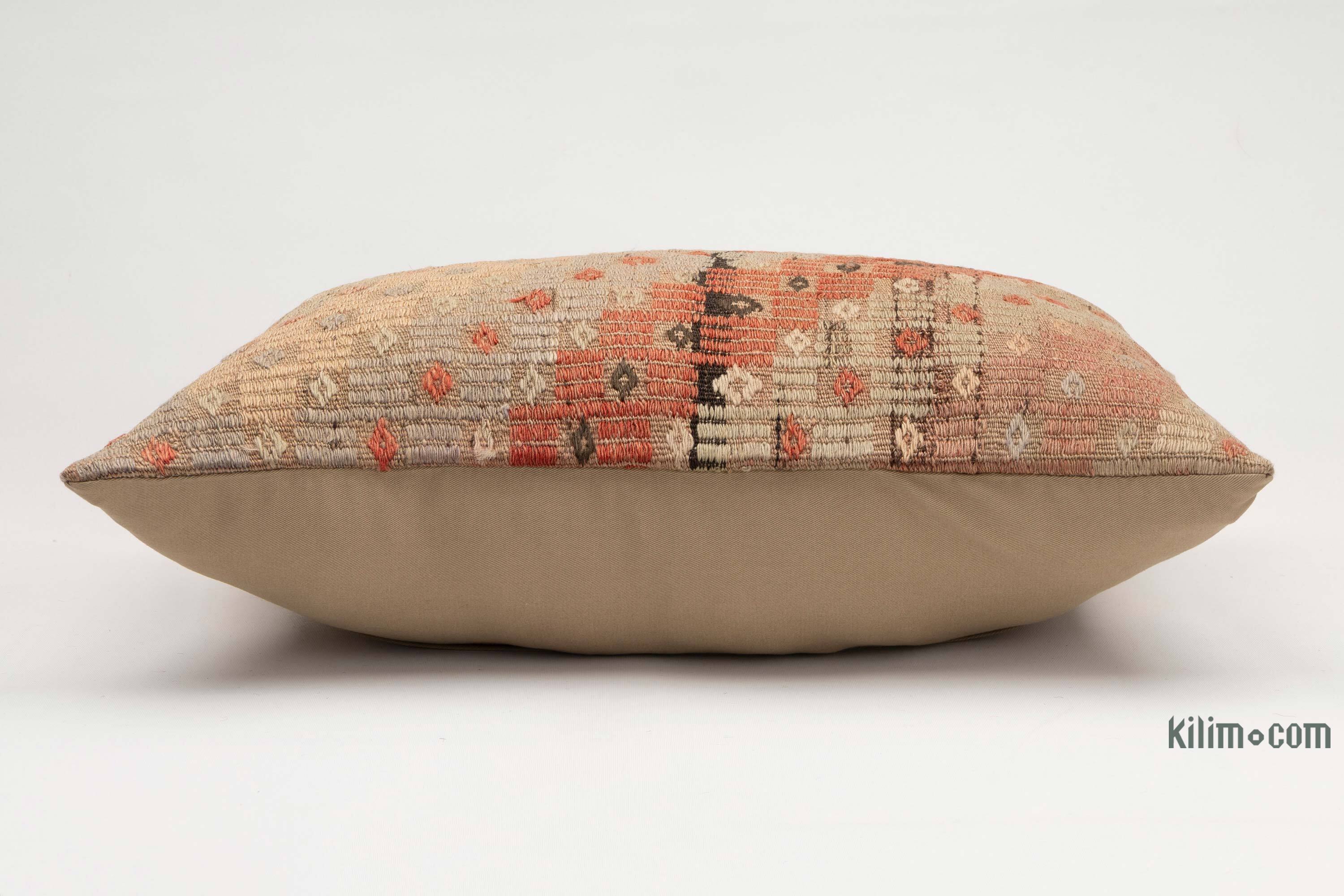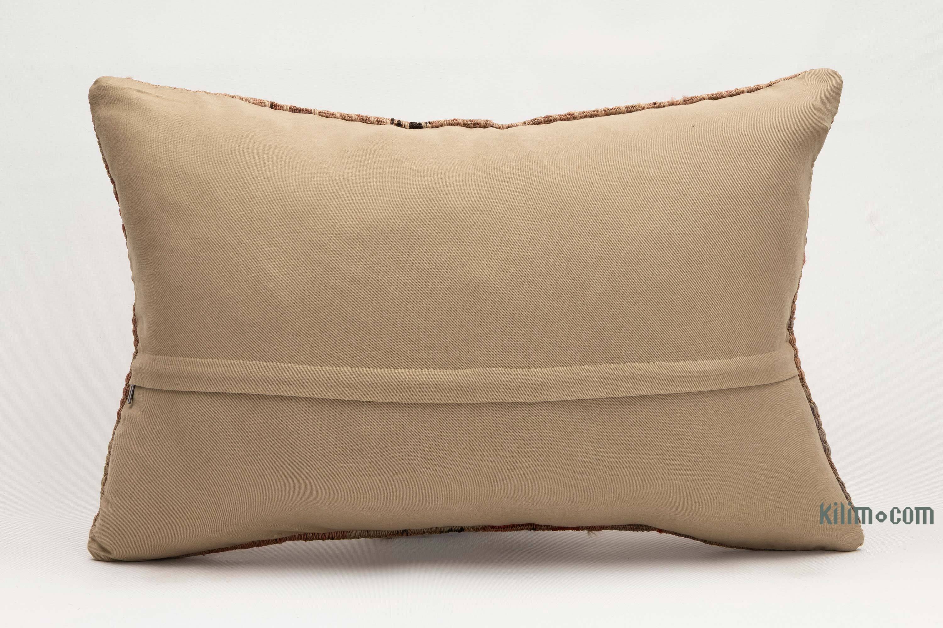 Funda de almohada tejida a mano decorativa hecha de fragmentos kilim turcos de 40-70 años respaldados con tela de algodón. Cierre de cremallera no está incluido.