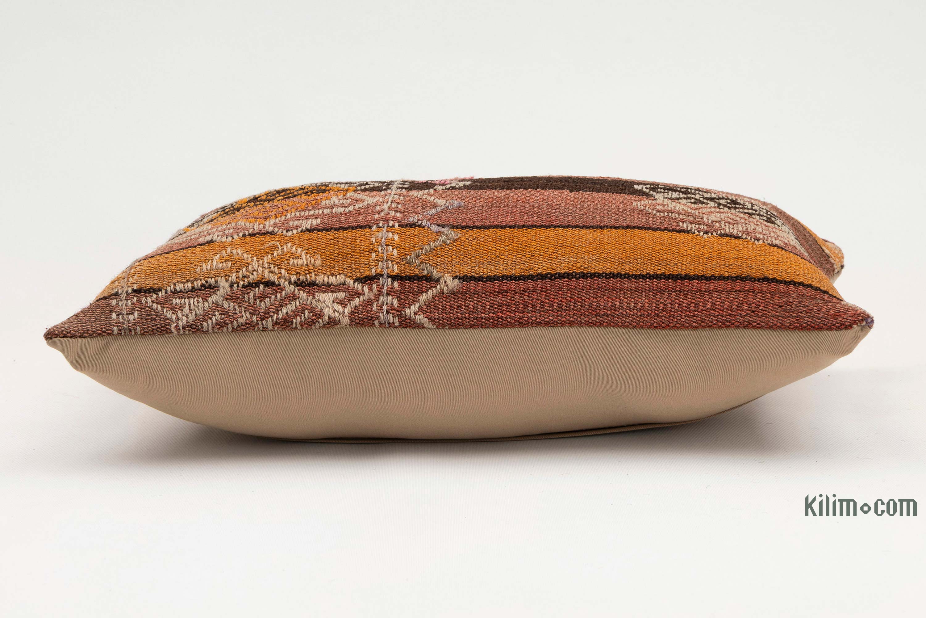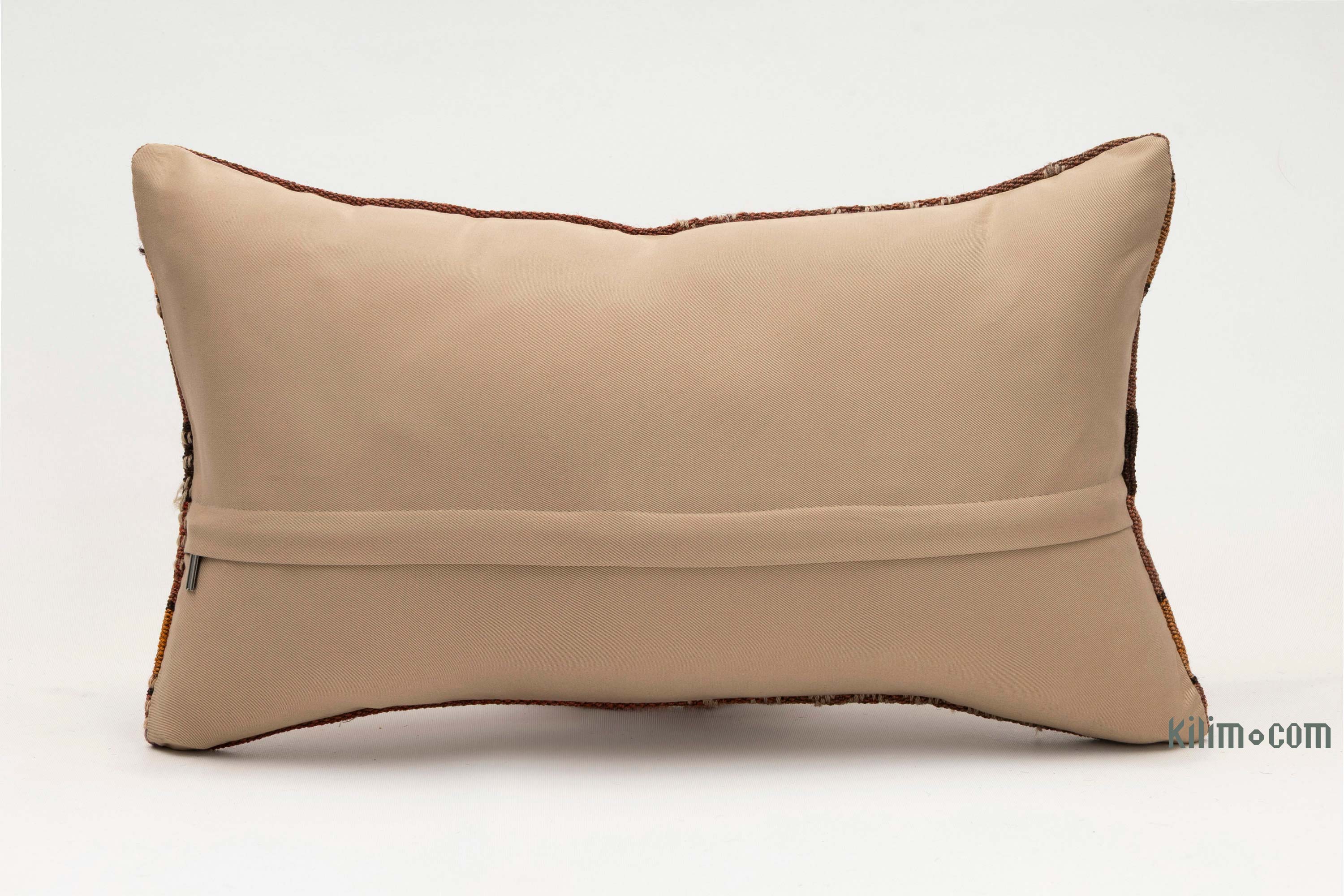 Funda de almohada tejida a mano decorativa hecha de fragmentos kilim turcos de 40-70 años respaldados con tela de algodón. Cierre de cremallera no está incluido.