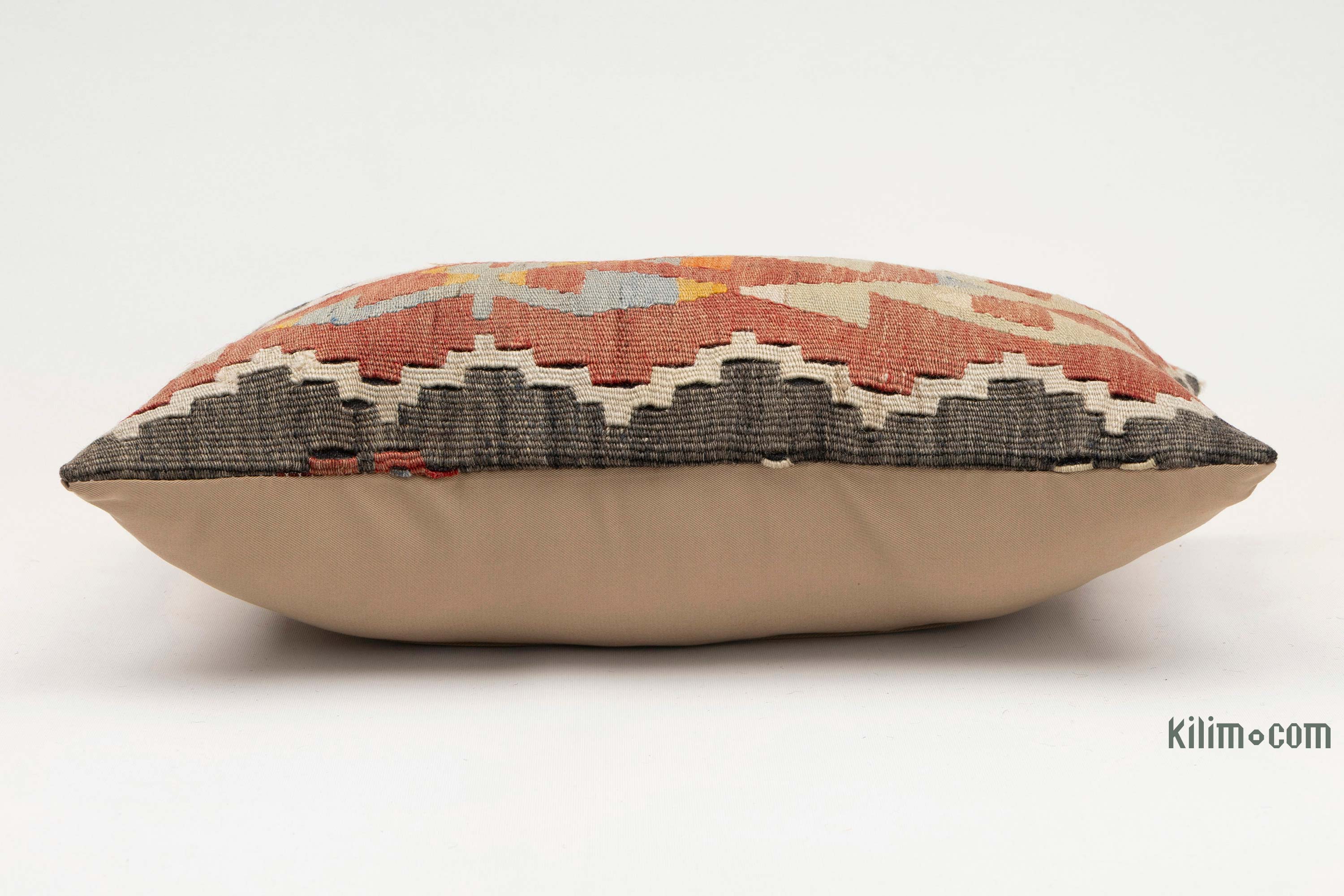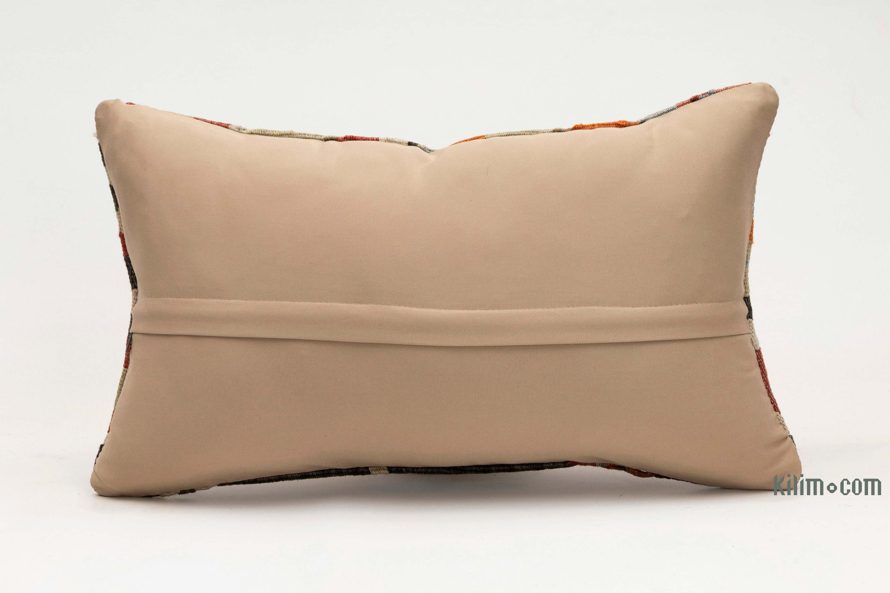 Funda de almohada tejida a mano decorativa hecha de fragmentos kilim turcos de 40-70 años respaldados con tela de algodón. Cierre de cremallera no está incluido.